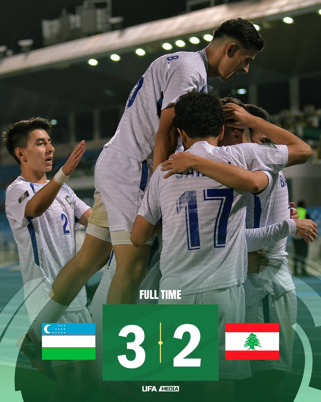 Uchrashuv yakunlandi. Jamoamiz musobaqaning ilk oʻyinida Livanni 3:2 hisobda magʻlub etdi Gollar: Saidov 24’, Xayrullayev 50’, Bahromov 57’ — Shahin 65’, 90+5’.